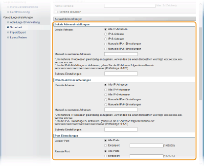 Wenn Sie [Manuelle IPv4-Einstellungen] oder [Manuelle IPv6-Einstellungen] für [Remote Adresse] ausgewählt haben, geben Sie die IP-Adresse ein, um die Richtlinie anzuwenden.