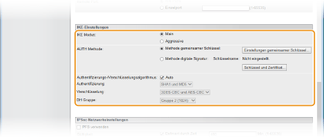 Wenn der aggressive Modus unter [IKE Modus] ausgewählt wird, führt die [Methode gemeinsamer Schlüssel] Einstellung keine Verschlüsselung beim gemeinsamen Schlüssel durch.