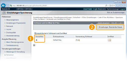2 | Wählen Sie das Schlüsselpaar aus, das Sie verwenden möchten und klicken Sie auf [Einstellungen Standardschlüssel]. Anzeigen von Details zu einem Schlüsselpaar oder Zertifikat |