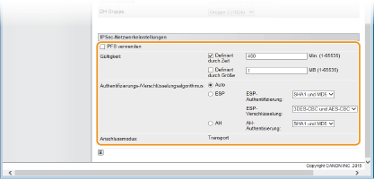 Legen Sie die Einstellungen für ESP und AH fest, die während der IPSec-Kommunikation zu den Paketen hinzugefügt werden. ESP und AH können nicht gleichzeitig verwendet werden. Sie können auch angeben, ob für eine größere Sicherheit PFS aktiviert sein soll.