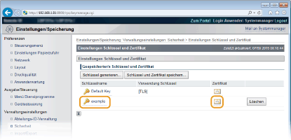 Ein Schlüsselpaar kann nicht gelöscht werden, wenn es gerade verwendet wird, wenn also beispielsweise "TLS" oder "IEEE 802.1X" unter [Verwendung Schlüssel] angezeigt wird. Deaktivieren Sie in diesem Fall die Funktion, oder ersetzen Sie das Schlüsselpaar, bevor Sie es löschen.