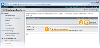 Sie können mit dem Gerät ein Schlüsselpaar generieren, wenn dies für die verschlüsselte Kommunikation über TLS (Transport Layer Security) erforderlich ist. Sie können TLS verwenden, wenn Sie über Remote UI auf das Gerät zugreifen oder IPP-Druck ausführen. Bis zu acht Schlüsselpaare, einschließlich der vorinstallierten Paare, können registriert werden. Selbstsignierte Zertifikate werden mit Schlüsselpaaren verwendet, die unter "Netzwerkkommunikation" generiert wurden. Über die "Schlüssel- und Zertifikat-Signieranforderung (CSR)" können Sie ein von einer Zertifizierungsstelle ausgegebenes digitales Zertifikat für das vom Gerät generierte Schlüsselpaar anfordern.