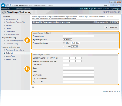 Legen Sie die Einstellungen für den Schlüssel und das Zertifikat fest.