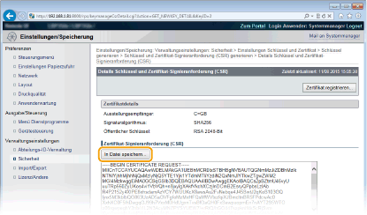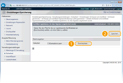 Klicken Sie auf [Durchsuchen] unter [Dateipfad], geben Sie die Datei für die Zertifikatsregistrierungsanforderung an, und klicken Sie auf [Speichern].