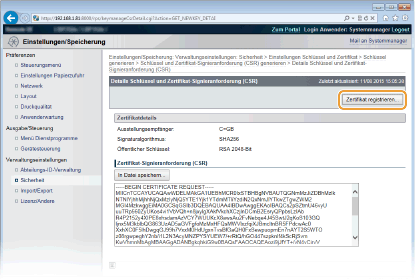 Sie können das durch die Zertifikatsregistrierungsanforderung (CSR) generierte Schlüsselpaar erst verwenden, wenn das Zertifikat registriert wurde. Nachdem die Zertifizierungsstelle das digitale Zertifikat ausgegeben hat, registrieren Sie es wie im Folgenden beschrieben.
