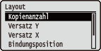 bis 9.999![]() | Die Einstellungen über die Druckdarstellung einschließlich der Bundstegränder und Druckpositionen werden anhand kurzer Erläuterungen aufgelistet. Die Standardeinstellungen sind mit einem Kreuzzeichen ( ) markiert. |