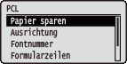 ![]() | Zu allen Einstellungen über die PCL-Steuerbefehle ist eine kurze Erläuterung angegeben. Die Standardeinstellungen sind mit einem Kreuzzeichen ( ) markiert. |