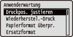 ![]() | Zu den Einstellungen über die Anpassung des Geräts einschließlich der Druckpositionskorrektur für die jeweilige Papierzufuhr und der Druckqualitätsverbesserung ist eine kurze Erläuterung aufgelistet. Sie können diese Einstellungen festlegen, wenn das Gerät offline ist. Die Standardeinstellungen sind mit einem Kreuzzeichen ( ) markiert. |