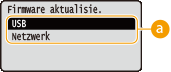 Für diese Zwecke können Sie nur den USB-Anschluss auf der rechten Seite des Geräts verwenden. Wenn der Bildschirm <Dateien können jetzt von USB-Speicher gedruckt werden.> bei verbundenem USB-Speicher angezeigt wird, drücken Sie ( ).Weitere Informationen zum Importieren bzw. Exportieren der Einstellungsdaten finden Sie unter Speichern/Laden von registrierten Daten. |