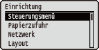 ![]() | Sie können die Einstellungen für die Betriebsumgebung des Geräts und für den Druck festlegen. Wenn Sie ( ) auf dem Bedienfeld drücken, wird das Konfigurationsmenü eingeblendet, um die Einstellungsoptionen unter der jeweiligen Funktionsoption anzuzeigen. |