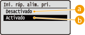 Si utiliza una redSu alguna de las opciones a continuación es <Activado>, la función de inicio rápido quedará deshabilitada. RARP, BOOTP, IPv6 Red Si utiliza la función MEAPCompruebe si las aplicaciones MEAP instaladas actualmente son compatibles con la función de inicio rápido. |