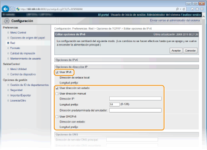 Seleccione la casilla de verificación [Usar IPv6] y configure las opciones necesarias.