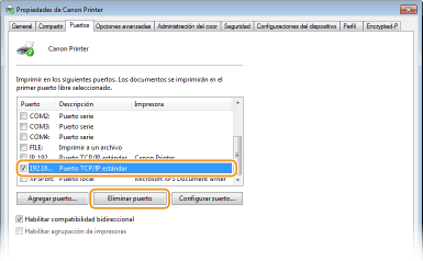 1 | Seleccione el puerto que quiere eliminar y haga clic en [Eliminar puerto]. ![]() ![]() No puede eliminar el puerto que esté configurado como puerto de la impresora. Para eliminar ese puerto, seleccione otro puerto y haga clic en [Aplicar] para configurarlo como el nuevo puerto de la impresora y, a continuación, elimine el puerto original. |