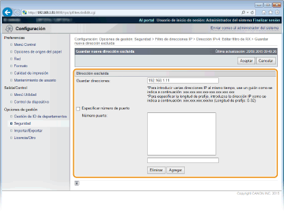 2 | Especifique las direcciones excluidas. Introduzca la dirección IP (o el rango de direcciones IP) en [Guardar direcciones]. Para especificar un número de puerto, seleccione la casilla de verificación [Especificar número de puerto], introduzca un número de puerto en [Número puerto] y haga clic en [Agregar]. Comprobación de los errores de entrada Si las direcciones IP o los números de puerto se introducen de forma incorrecta, es posible que no pueda acceder al equipo desde la IU remota, en cuyo caso deberá establecer <Filtro de direcci.> como <Desactivado>. Filtro de direcci.Para eliminar un número de puerto establecido Seleccione el número de puerto para eliminar y haga clic en [Eliminar]. |