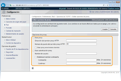 Para configurar o cambiar la contraseña para la autenticación de proxy, cuando está habilitada, seleccione la casilla de verificación e introduzca caracteres alfanuméricos en la nueva contraseña en el cuadro de texto [Contraseña]. A modo de confirmación, introduzca la misma contraseña en el cuadro de texto [Confirmar].
