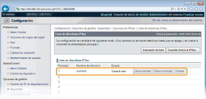 Ordene las directivas que aparecen en [Lista de directivas IPSec].