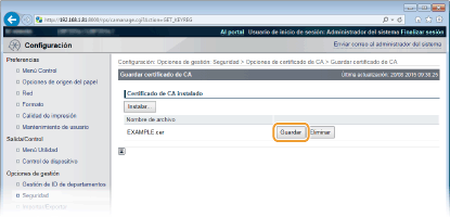 Haga clic en [Guardar] en la parte derecha del certificado de CA que desee registrar.