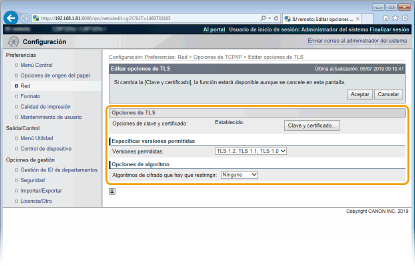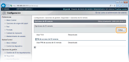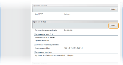 Cuando TLS ya está habilitado por [Opciones de IU remoto] o [Opciones de impresión IPP], [Opciones de clave prefijada] no aparecerá. Para cambiar la clave para utilizar, consulte el paso 6 y quite la marca de las casilla de verificación [Usar TLS] en [Opciones de IU remoto] o [Opciones de impresión IPP], respectivamente.