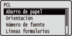 ![]() | Todas las opciones sobre los comandos de control de PCL se muestran con descripciones breves. Las opciones predeterminadas aparecen marcadas con una cruz ( ). |