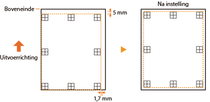 Als de markeringen van de afdrukpositie niet op de juiste positie worden afgedrukt, moet u de afdrukpositie aanpassen. Als u de afdrukpositie aanpast, geef dan de richting op met behulp van '+' en '-' en de afstand met behulp van 'mm'. Gebruik '-' om de afdrukpositie omhoog en '+' om hem omlaag te bewegen (verticale positiecorrectie). Gebruik '-' om de afdrukpositie naar links en '+' om hem naar rechts te bewegen (horizontale positiecorrectie).