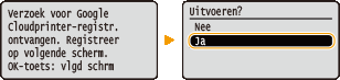 Registreren vanaf een mobiel toestel of vanuit Google ChromeU kunt het apparaat ook registreren met behulp van een mobiel toestel of Google Chrome. Het display van het apparaat toont het volgende bevestigingsscherm voordat de registratie wordt voltooid. Selecteer  <Ja>  om de de registratie te voltooien. De registratie kan alleen vanuit het hoofdscherm uitgevoerd worden. Druk op  (  ) om het hoofdscherm op te roepen en ga vervolgens door met de registratie. Zie voor de registratieprocedure de instructie hadden voor uw mobiele toestel of de website van Google Cloud Print. |