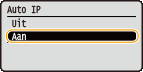 Stel alle protocollen in op <Uit>. Als u <Gebruik DHCP>, <Gebruik BOOTP>, of <Gebruik RARP> instelt op <Aan> wanneer de DHCP/BOOTP/RARP servers niet beschikbaar zijn, verspilt het apparaat tijd en communicatiemiddelen door op het netwerk naar beschikbare services te zoeken.