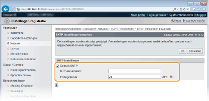 Met SNTP (Simple Network Time Protocol) kunt u de systeemklok synchroniseren met de tijdserver in het netwerk. Als u SNTP gebruikt, controleert het systeem regelmatig de tijdserver, zodat de systeemklok altijd accuraat is.