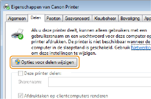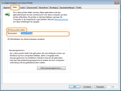 Om de onderstaande procedure uit te voeren, moet u zich bij de computer aanmelden met een administratoraccount. Afhankelijk van het besturingssysteem en de bitarchitectuur (32-bits of 64-bits) van de printserver en de clientcomputers, is het misschien niet mogelijk printerstuurprogramma's via het netwerk te installeren. Overleg met uw netwerkbeheerder als u een printserver wilt implementeren in een domeinomgeving. |