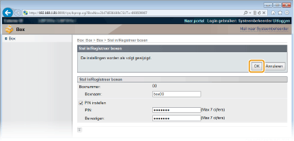 U kunt een naam voor een vak instellen en een pincode op het vak te openen. Als u een vriendelijke naam voor het vak instelt, kunt u het vak gemakkelijk herkennen als u met behulp van het printerstuurprogramma de plaats selecteert waar u de documenten wilt opslaan. Als u een pincode instelt, kunnen de opgeslagen documenten uitsluitend worden geopend door een beperkt aantal gebruikers, hetgeen de veiligheid verhoogt.