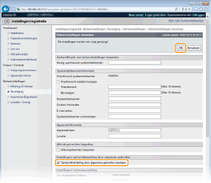 Schakel het selectievakje [Opdrachthandeling door algemene gebruiker toestaan] in en klik op [OK].