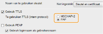 1 | Schakel het selectievakje [Gebruik TTLS] of [Gebruik PEAP] in. Intern protocol voor TTLS U kunt MSCHAPv2 of PAP selecteren. Als u PAP wilt gebruiken, klik dan op het keuzerondje [PAP]. |