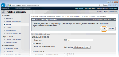 Schakel het selectievakje [Gebruik IEEE 802.1X] in, typ de aanmeldingsnaam in het vak [Loginnaam] en geef de vereiste instellingen op.