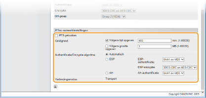 Geef de instellingen op voor ESP en AH, die tijdens IPSec-communicatie worden toegevoegd aan pakketten. ESP en AH kunnen niet tegelijkertijd worden gebruikt. U kunt ook aangeven of u PFS wilt inschakelen voor een nog betere beveiliging.