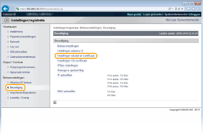 U kunt het sleutelpaar dat is gegenereerd door het Certificate Signing Request (CSR) pas gebruiken als het certificaat is geregistreerd. Registreer het digitale certificaat wanneer de certificeringsinstantie het heeft uitgegeven en volg daarvoor onderstaande procedure.