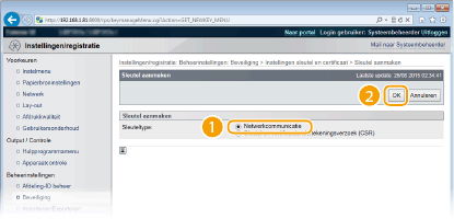 Een sleutelpaar kan worden gegenereerd met het apparaat wanneer dat nodig is voor versleutelde communicatie via Transport Layer Security (TLS). U kunt TLS gebruiken wanneer u toegang wenst tot het apparaat via de externe UI of IPP Print verricht. Er kunnen maximaal acht sleutelparen (inclusief de vooraf geïnstalleerde paren) worden geregistreerd op het apparaat. Zelf-gesigneerde certificaten worden gebruikt met sleutelparen die zijn gegenereerd in 'Netwerkcommunicatie'. Met een 'Sleutel en certificaatondertekeningsverzoek (CSR)' kunt u een CA-uitgegeven digitaal certificaat voor het sleutelpaar aanvragen, dat is gegenereerd door het apparaat.