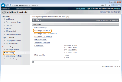 1 | Klik op [Beveiliging]  [Instellingen externe UI]. |