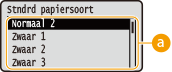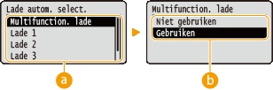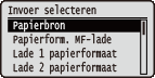 ![]() | De instellingen voor de papierbron en het papierformaat dat in het apparaat is geladen, worden in een lijst geplaatst en kort toegelicht. Als u ( ) op het bedieningspaneel indrukt, verschijnt het menu Invoer selecteren. Standaardinstellingen worden aangegeven met een dolksymbool ( ). |