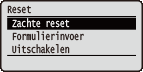 | U kunt alle processen annuleren, gegevens in het geheugen verwijderen en het apparaat uitschakelen. Als u  (  ) op het bedieningspaneel indrukt, verschijnt het menu Reset. |