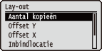 tot 9999![]() | De instellingen voor het verschijnen van de afdruk, inclusief rugmarges en afdrukposities verschijnen in een lijst, met korte beschrijvingen. Standaardinstellingen worden aangegeven met een dolksymbool ( ). |