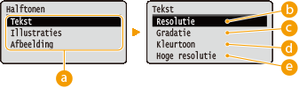 Selecteer het soort afbeeldingsgegevens waarvoor de instellingen worden veranderd. Selecteer <Tekst> voor tekens, <Illustraties> voor lijnen en figuren, of <Afbeelding> voor afbeeldingen zoals foto's.