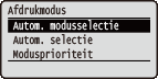 Als alle afdrukmodi zijn ingesteld op <Uit>, werkt het apparaat in de afdrukmodus die is opgegeven voor <Modusprioriteit>. |
