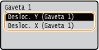 <Desloc. Y (2 Lados)> e <Desloc. X (2 Lados)> permitem ajustar a posição de impressão na primeira página (frente). A posição de impressão na segunda página (verso) será ajustada com base nos valores definidos para cada origens do papel.