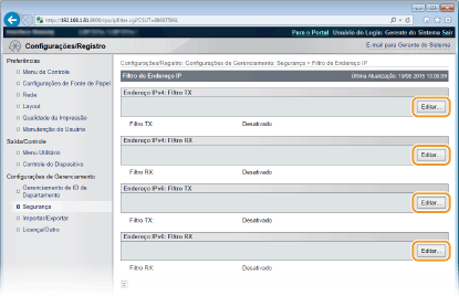 Se os endereços IP não forem introduzidos corretamente, pode não conseguir aceder à máquina a partir da Interface Remota; nesse caso, será necessário definir <Filtro de Endereço> para <Desativado>. Filtro de Endereço