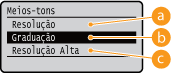 Todas as definições relativas a ficheiros de imagem (ficheiros JPEG e TIFF) disponíveis para Impressão direta por USB, Impressão direta e Impressão de correio eletrónico estão listadas com descrições curtas. As predefinições estão assinaladas com uma cruz (