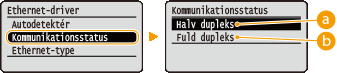 2 | Vælg kommunikationstilstanden. Vælg <Kommunikationsstatus> Vælg <Halv dupleks> eller <Fuld dupleks> ![]() ![]() <Halv dupleks>Sender og modtager kommunikationsdata skiftevis. Vælg, om maskinen er tilsluttet en netværksenhed, der anvender halv dupleks. <Fuld dupleks>Sender og modtager kommunikationsdata samtidigt. Brug denne indstilling for de fleste miljøer. |