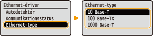 3 | Vælg Ethernet-typen. Vælg <Ethernet-type> Vælg Ethernet-typen ![]() ![]() ![]() Hvis du vælger <1000 Base-T>, ændres indstillingen for <Kommunikationsstatus> til <Fuld dupleks>. |