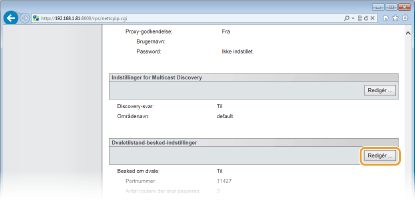Du kan gøre indsamling og administration af forskellige oplysninger om enheder i netværk nemmere ved at implementere software til styring af enheder, f.eks. iW Management Console, på netværket. Oplysninger som f.eks. enhedsindstillinger og fejllogge hentes og distribueres via servercomputeren. Hvis maskinen er koblet til et sådant netværk, søger iW Management Console efter maskinen på netværket ved hjælp af protokoller som f.eks. SLP (Service Location Protocol) for at indsamle oplysninger fra maskinen, herunder status for tændt/slukket. SLP-indstillingerne kan angives ved hjælp af Brugerinterface til fjernbetjening.