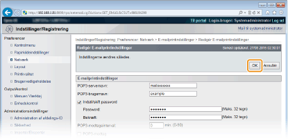 For at indstille den adgangskode, der skal bruges til at oprette forbindelse til mailserveren, skal du markere afkrydsningsfeltet og indtaste alfanumeriske tegn for adgangskoden i tekstfeltet [Password]. For at bekræfte skal du indtaste samme adgangskode i tekstfeltet [Bekræft].