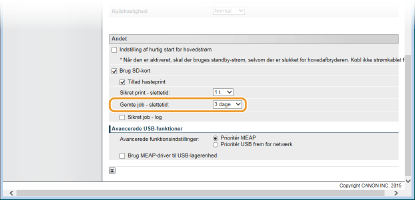 De data, der gemmes på SD-kortet, er som standard indstillet til automatisk at blive slettet, hvis der går et vist stykke tid, og kan ikke længere udskrives. Hvis du ønsker at ændre, hvor lang tid SD-kortet skal gemme dokumenterne, eller forhindre den automatiske sletning af dokumenterne, skal du ændre de pågældende indstillinger i Brugerinterface til fjernbetjening. De gemte dokumenter kan også slettes manuelt.