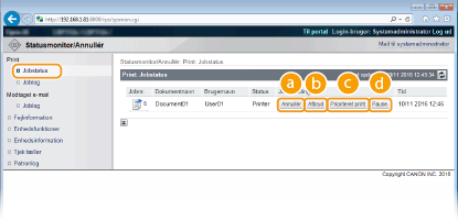 Status for alle udskrivningsjob vises uanset indstillingerne for administration af afdelings-id. Standardindstillingerne forhindrer visse handlinger, som f.eks. at slette et dokument i at blive udskrevet eller forstyrre et udskrivningsjob, i at blive udført i tilstande som generel bruger. Hvis du ønsker at anvende dokumenter i tilstand som generel bruger, skal du logge på i administratortilstand og aktivere [Tillad generel brugers jobhandling]. Gøre slutbrugerne i stand til at bruge dokumenterneHvis du indtastede dit brugernavn, da du loggede på som almindelig bruger, vises dit brugernavn kun på de dokumenter, som du udskrev. Klik på [Jobnr.] på de midlertidigt afbrudte dokumenter, og sikr dokumenter for at vise detaljerede oplysninger. Du kan kontrollere brugernavnet og sideoptællingen for det udskrevne dokument. |